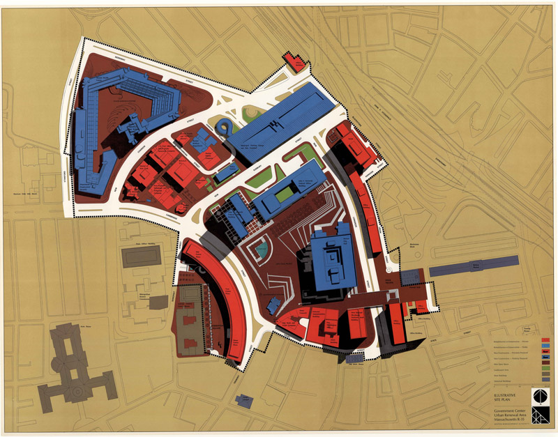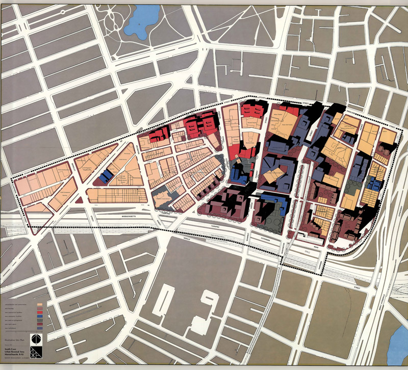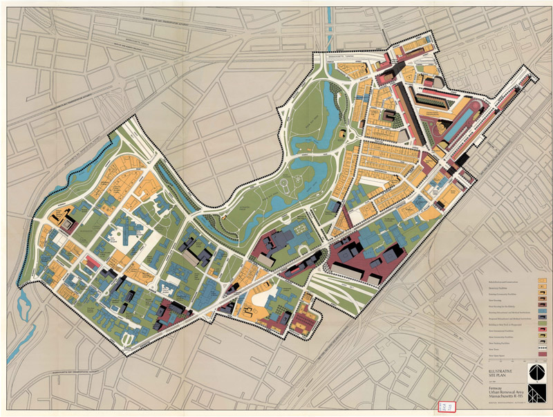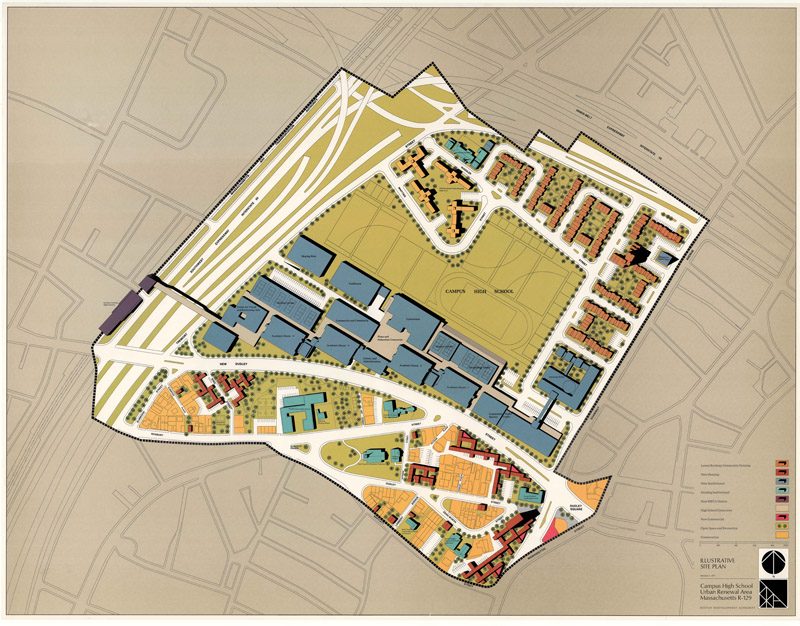 Explore a historic collection of illustrative site plans highlighting urban renewal projects across Boston.