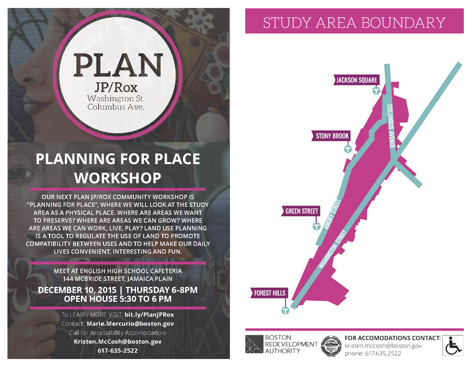 Description: PLAN: JP/Rox is a community-based visioning and planning process for the area between Washington Street, Columbus Avenue, and Amory Streets in Jamaica Plain and Roxbury. The most recent PLAN: JP/Rox Community Workshop was "Planning for People" and we discussed and exchanged information around housing and affordability; jobs and businesses; environmental sustainability; and community cohesion. Our next PLAN: JP/Rox Community Workshop is "Planning for Place" where we will look at the study area as a physical place. Where are areas we want to preserve? Where are areas we can grow? Where are areas we can work, live, play? Land use planning is a tool to regulate the use of land to promote compatability between uses and to help make our daily lives convenient, interesting and fun. Help to shape the vision of the study area through the next PLAN: JP/Rox Community Workshop through information and discussions around land use planning. The Open House starts at 5:30 PM, come early to talk to neighbors and staff. The Workshop begins at 6:00 PM.