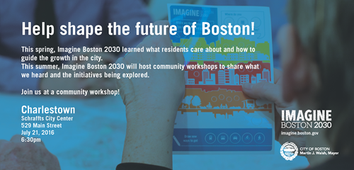 Description: This spring, Imagine Boston 2030 learned what residents care about and how to guide the growth in the city. This summer, Imagine Boston 2030 will host community workshops to share what we heard and the initiatives being explored.