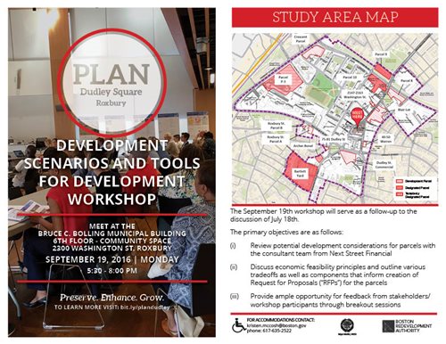 Description: 5:30 pm - 6:00 pm Open House and Networking 6:00 pm - 8:00 pm Presentation and Workshop The September 19th workshop will serve as a follow-up to the discussion of July 18th The primary objectives are as follows: (i) Review potential development considerations for parcels with the consultant team from Next Street Financial; (ii) Discuss economic feasibility principles and outline various tradeoffs as well as components that inform creation of Request for Proposals (“RFPs”) for the parcels; and (iii) Provide ample opportunity for feedback from stakeholders/workshop participants through breakout sessions; PLAN: Dudley Square is an initiative to think strategically about the types of uses and the scale of development best suited for the future of Dudley Square and Roxbury. The goals of this study are to provide an inclusive community engagement process, create an updated vision with the community, and establish an implementation plan that will lead to the issuance of Requests for Proposals ("RFPs") for publicly-owned and vacant privately-owned parcels in Dudley Square. We look forward to having you join us at the workshop.