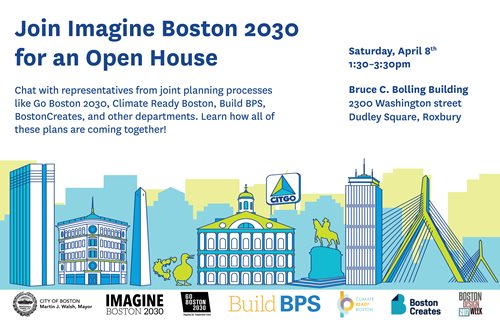 Description: Join Imagine Boston 2030 for an Open House on Saturday, April 8 from 1:30 PM–3:30 PM at the Bruce C. Bolling Building (2300 Washington Street, Dudley Square, Roxbury). Chat with representatives from joint planning processes like Go Boston 2030, Climate Ready Boston, Build BPS, BostonCreates, and other departments and learn about how all of these plans are coming together!