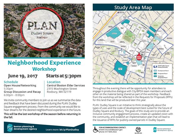 Description: Please note: due to a power outage, the meeting location has been changed to the Boston Police District B-2 station at 2400 Washington Street, Roxbury, MA 02119. We invite community members to join us as we summarize the data and feedback that have been discussed during the PLAN: Dudley Square engagement process. From the community we would like hear dreams regarding the desired neighborhood experience in the future. This will be the last workshop of the season before returning in the fall. Feedback from the workshop will be reflected in the Requests for Proposals (RFPs) for this land that will be produced later this year. Throughout the evening there will be opportunity for attendees to engage in productive dialogue with City/BPDA team members and each other on elements of the material being shared as part of the workshop. PLAN: Dudley Square is an initiative to think strategically about the types of uses and the scale of development best suited for the future of Dudley Square and Roxbury. The goals of this study are to provide an inclusive community engagement process, create an updated vision with the community, and establish an implementation plan that will lead to the issuance of RFPs for publicly-owned parcels in Dudley Square. We look forward to having you join us at the workshop.