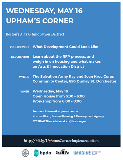 Description: Learn about the RFP process, and weigh in on housing and what makes an Arts & Innovation District. Open House 5:30 PM - 6:00 PM and Workshop from 6:00 PM - 8:00 PM. Light refreshment will be provided.