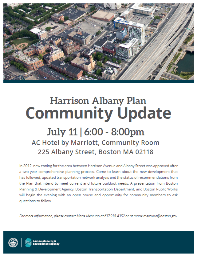 Description: In 2012, new zoning for the area between Harrison Avenue and Albany Street was approved after a two year comprehensive planning process. Come to learn about the new development that has followed, updated transportation network analysis and the status of recommendations from the Plan that intend to meet current and future build-out needs. A presentation from the Boston Planning & Development Agency, Boston Transportation Department, and Boston Public Works will begin the evening, with an open house and opportunity for community members to ask questions to follow. To request interpretation services, please contact Marie Mercurio by July 3.