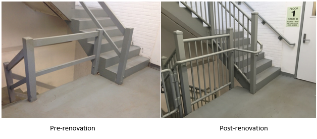 The post-renovation view demonstrates dramatic improvements that incorporate a continuous handrail along the interior, new handrails at the wall, higher guardrails, a gate to the basement, and new larger, glow-in-the-dark signage to aid tenants in the event of an emergency evacuation.