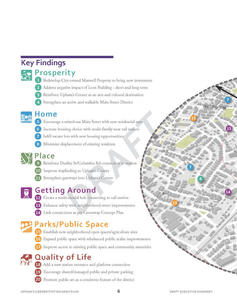 , which reimagines the Fairmount Commuter Rail line as a local transit amenity which will catalyze community and economic growth around stations. Over the past year, the BRA's Planning Division has worked with consultants to conduct community workshops and public meetings to develop a shared vision for the Upham's Corner Station Area. A Working Advisory Group (WAG) comprised of local residents, business owners, and stakeholders also helped guide the study and plan.