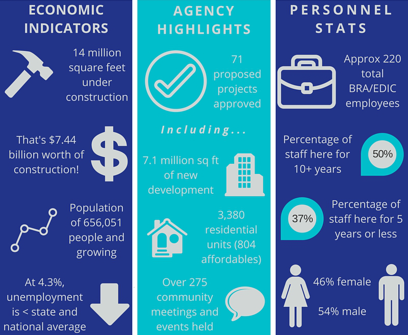 2015 was a busy year for the Boston Redevelopment Authority and an exciting one for development in the city, as several major projects opened and several others broke ground. As the year draws to a close, we’ve compiled a few highlights to sum up the activity and provide a little insight about the people behind the work. We hope you enjoy the infographic to the right, and if you’re interested to learn more about the city we call home be sure to check out our Research Division’s new