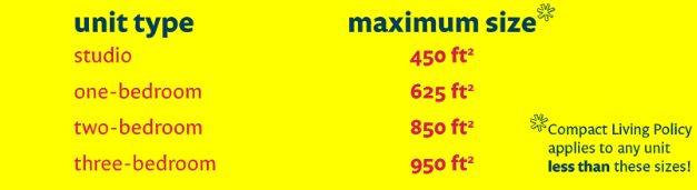 The design standards outlined in the Compact Living Policy are meant to minimize personal space without reducing livability, and foster resident community through thoughtfully designed interior and exterior shared spaces. Unit interior guidelines prioritize function, storage, and natural light. Shared spaces should foster interaction, provide functional space that would otherwise be located inside a traditional unit, be located on a common path of travel, and be properly managed and maintained.