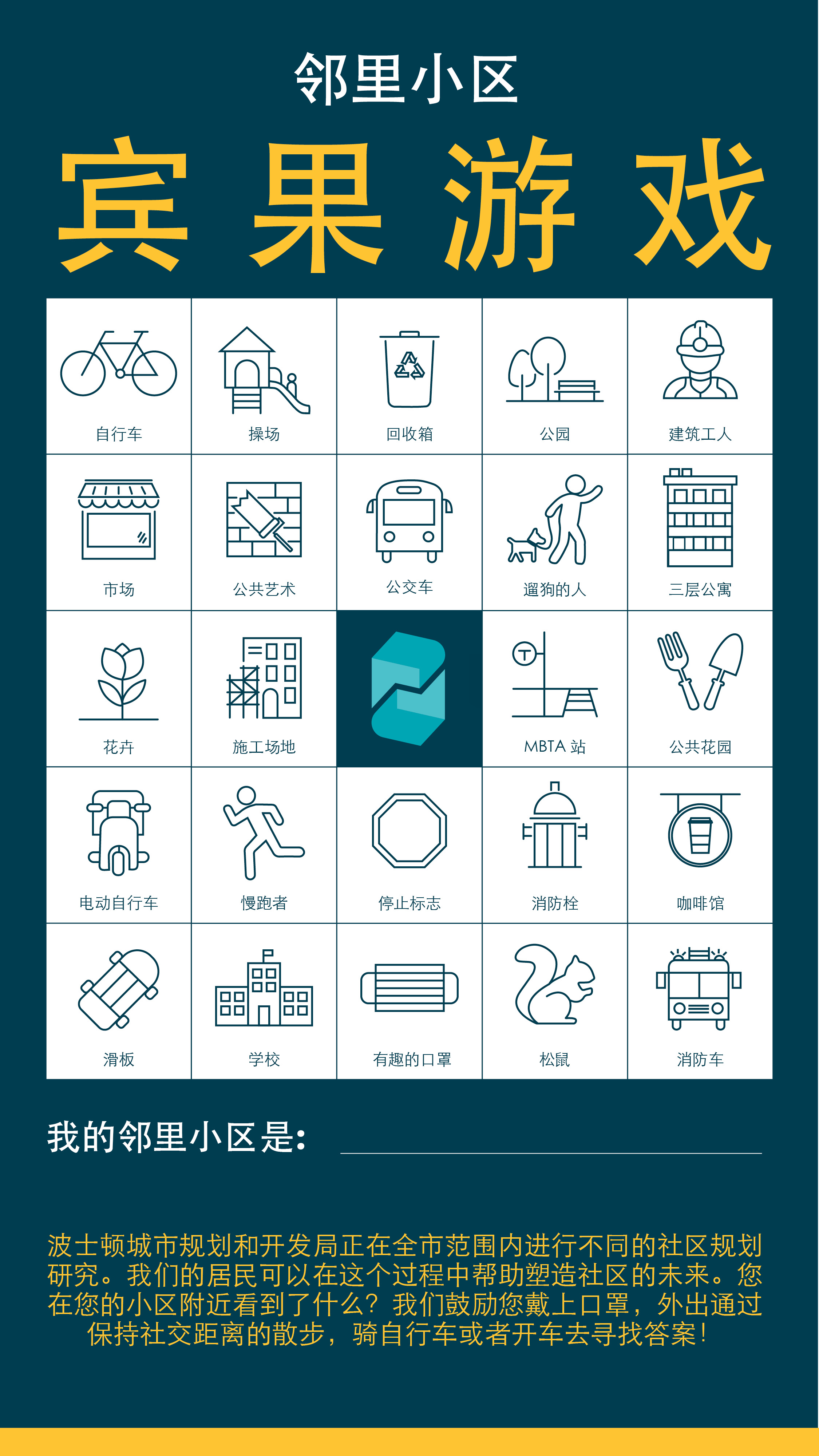The BPDA encourages residents to seek out the BINGO card items in their neighborhood while wearing a face covering and maintaining social and physical distancing. BINGO cards can be downloaded from the agency's website in English, Spanish, or Mandarin Chinese.