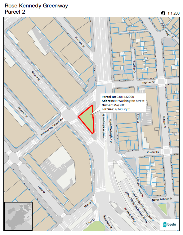 In July, 2022 the Boston Planning & Development Agency (BPDA), in partnership with the Massachusetts Department of Transportation (MassDOT) and the Greenway Conservancy, completed the construction of the North Meadow on the Greenway, completing what was formerly known as the Central Artery Parcel 2 Park Design Process. The North Meadow on the Greenway is a 5,000 square-foot park located between the Bulfinch Triangle and the North End and bordered by North Washington Street, Anthony “Rip” Valenti Way, and Beverly Street. The BPDA led an eight-month design process that culminated in the construction of a new park. It is the northernmost terminus to the Rose Kennedy Greenway park network.