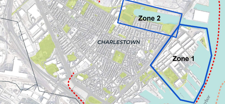 The Charlestown Navy Yard study area will include the harborside and adjacent properties between Pier 3 (a BPDA owned property) to the eastern edge of Barry Field (Zone 1) and the Harborwalk section from Barry Field all around the Little Mystic Channel (Zone 2) (the “Study Area”). These two zones will be the areas of focus for flood mitigation designs during this study, but many areas of the larger Charlestown neighborhood may benefit from the project. See Location Map below.