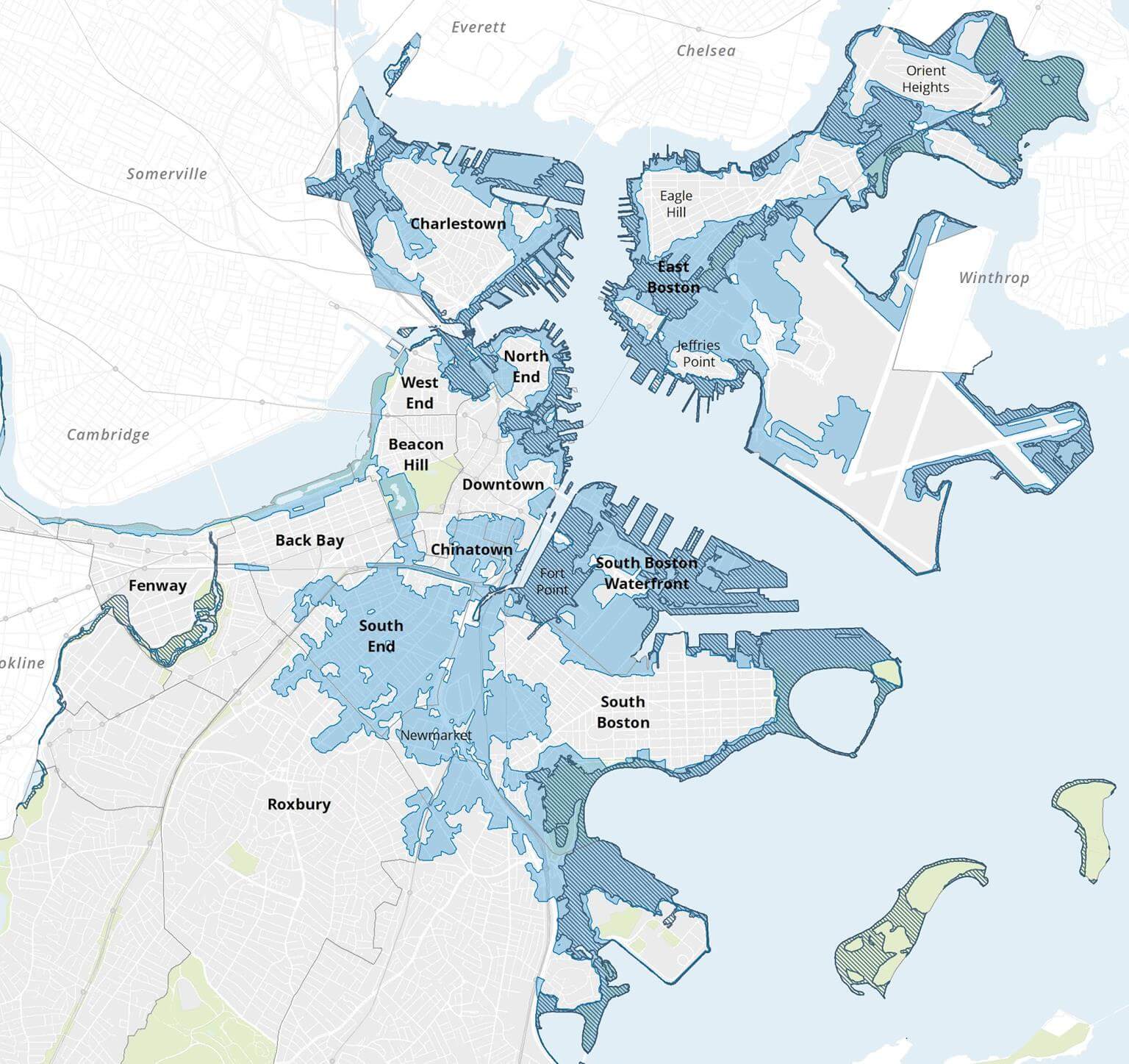 The Raymond L. Flynn Marine Park (RLFMP) is one of the more vulnerable areas of the city to current and future coastal flooding events. The City of Boston publications Climate Ready Boston (2016) and Coastal Resilience Solutions for South Boston (2018) (CRS South Boston) outline the extent of the need for increased flood resilience and propose district-scale design options for increasing resiliency.The report identifies current flood pathways and those that will be more prominent as soon as 2030 with a 1% chance of storm events and 9 inches of sea level rise. Early flood pathways include the northeastern edge of the RLFMP to the east of Drydock 4, which combines with flood pathways from Seaport Boulevard to the west of the park and a pathway at the North Jetty. Another flood pathway westward from Pier 10 affects transportation routes in the Park.