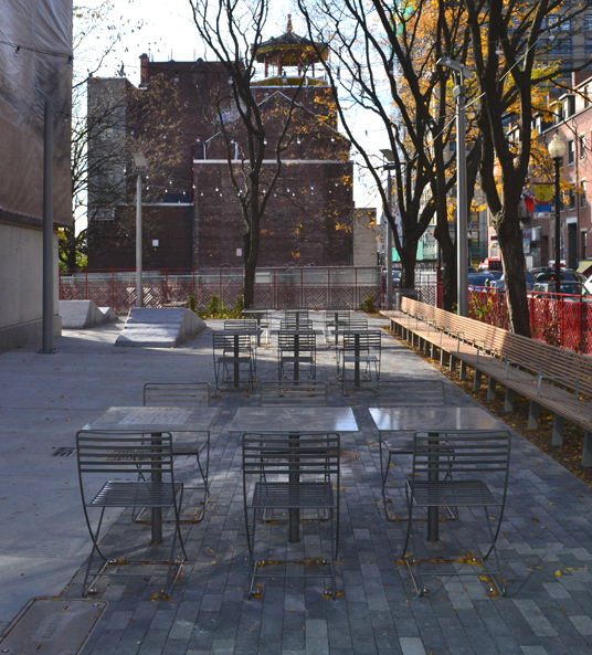Work generally consists of demolition of the old park, drainage upgrades, new concrete and pavers, poles and hanging lights, 5 illuminated granite elements, benches and carousel tables, chess table, Mary Soo Hoo Park sign, fence, plantings, and community bulletin board.