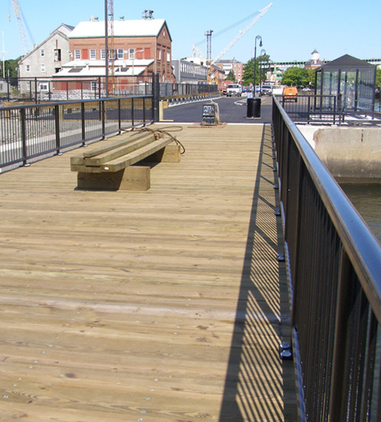 Work generally consists of demolition of an existing timber pier, construction of new timber pier, construction of steel sheet pile bulkhead and batter piles, relocation and installation of MBTA floating dock, installation of bow loading float and surface improvements on the existing pier.