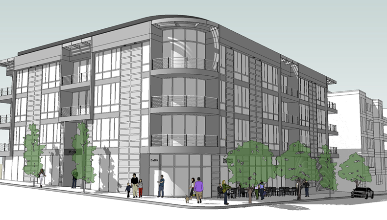 Proposal calls for the construction of 30 residential units, 2,230 SF of ground floor restaurant space with 54 off-street parking spaces.