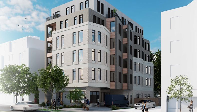 The proposed project includes the demolition of an existing three-story residential structure and the construction of a six-story, twenty-five (25) unit multi-family building. The new building will include thirteen (13) one-bedroom units, three (3) two-bedroom units and nine (9) three-bedroom units. The development will replace an existing parking area at the rear of the site with shared open space for building residents, reducing impervious surface and increasing usable green space.
