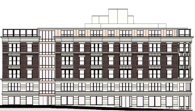 A new six-story building with 35 residential apartment units on floors two through five above 3,165 square feet of ground-floor commercial space intended to include a restaurant.