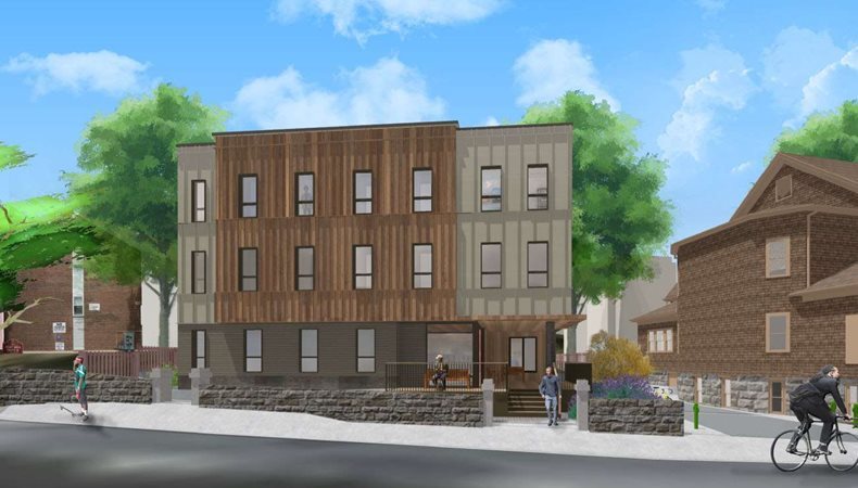 The proposed development, conceived as a two-phase project, will include the rehabilitation of the historic church building for a commercial use, construction of a new building containing 14 units of work force housing, and 13 parking spaces shared by both buildings.