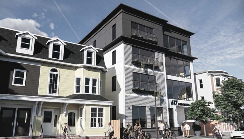 The proposed project consists of a new four-story residential building situated on a through lot fronting both Dorchester Avenue and Boston Street. The project is located on a vacant 6,135 square foot parcel and proposes the construction of eighteen residential condominium units, with a residential lobby, bike parking room, trash area, community room, and a spacious common roof deck. The main entrance is provided at-grade and accessed on Dorchester Avenue. The building also includes an accessible basement, providing private storage rooms for each unit. There are accessible paths that run parallel along the entire site, allowing for passage to either Dorchester Avenue or Boston Street, installed with privacy gates to ensure the security and privacy of the residents. Residential units are located on every level, although units on the first floor have been raised above the SLR-BFE. Owing to proximity to the MBTA’s Andrew Station on the Red Line, no on-site motor vehicle parking is proposed.