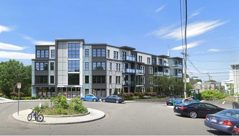 Combine three lots, raze three existing structures, and erect a new residential building with 44 rental units and 28 below-ground parking spaces.