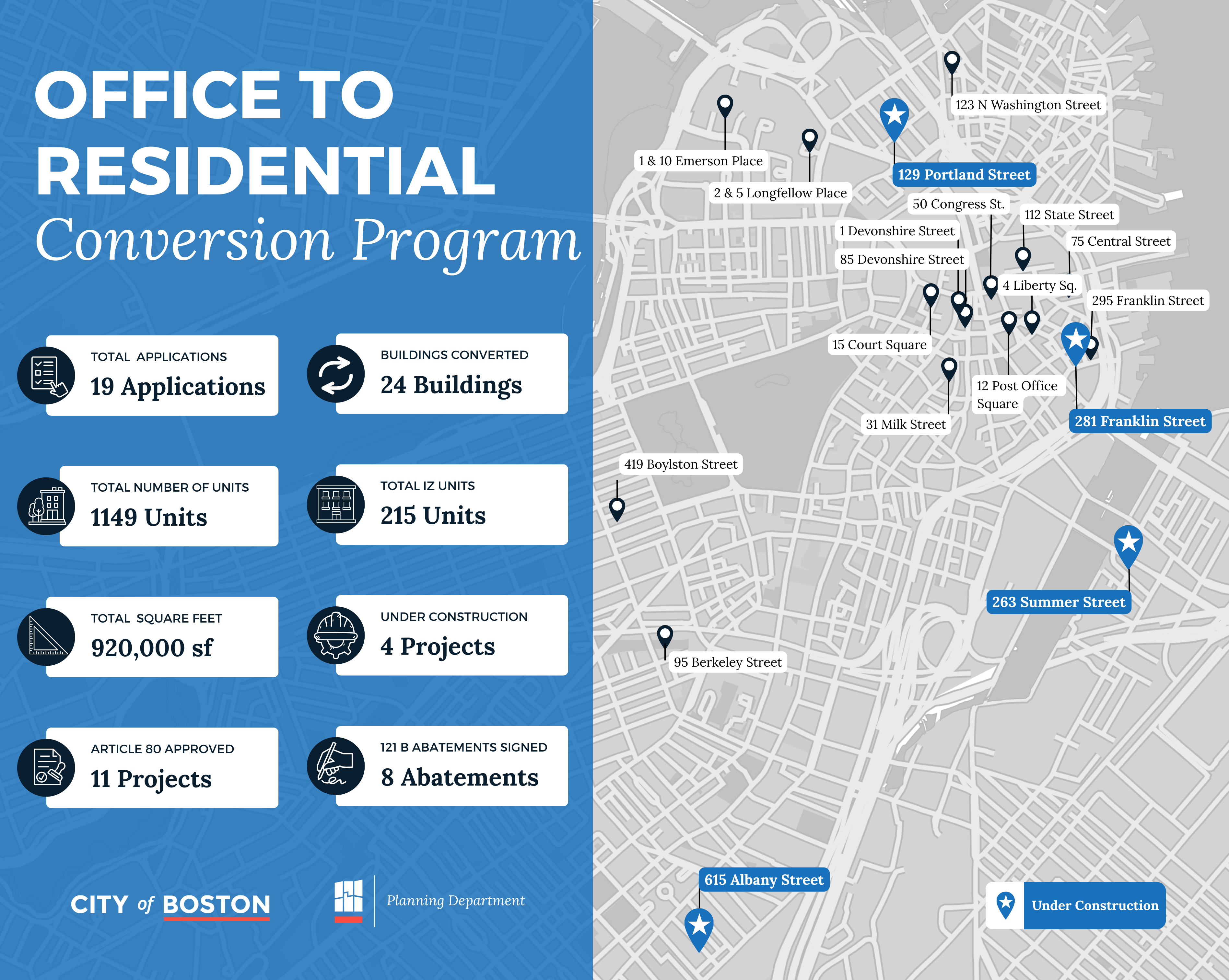 Conversion of underutilized office space is an important response to post-pandemic economic and workforce shifts that appear to be long-lasting. These challenges exist beyond Boston and are receiving broader attention at the national and state levels with other major cities including Chicago and Pittsburgh, which have also launched similar programs in response. The City’s program is designed to help increase economic activity in Downtown Boston by increasing the amount of people living downtown, while helping stabilize the office market.