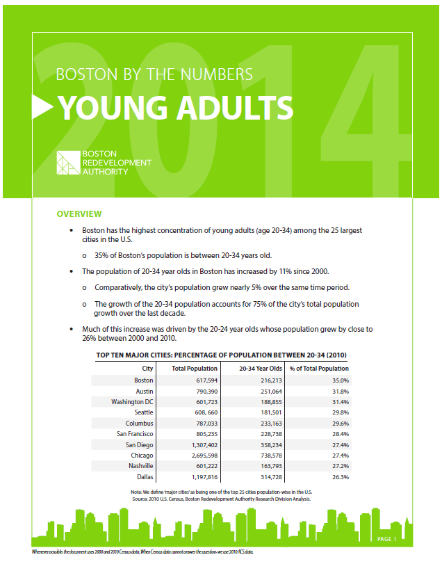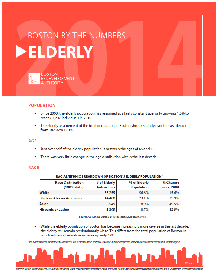 Boston by the Numbers is a series created by the Research Division that highlights the characteristics of Boston's population and economy. The data in this report is a combination of Decennial Census and 2006-2010 American Community Survey data. This report has been revised to use the boundaries for the West End and Downtown that went into effect in 2014.