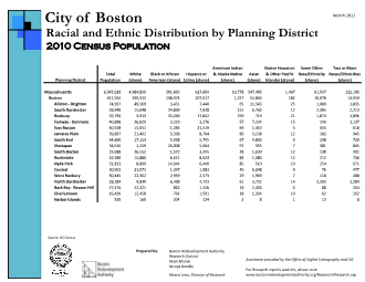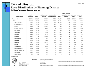 The distribution of race by planning district for the 2010 Census population of Boston.