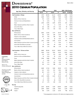 | The neighborhood of Downtown by Age, Race, Ethnicity and Housing from the 2010 Census.