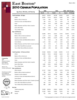 | The neighborhood of East Boston by Age, Race, Ethnicity and Housing from the 2010 Census.