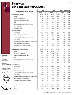 | The neighborhood of Fenway by Age, Race, Ethnicity and Housing from the 2010 Census.