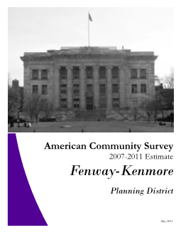 | This publication features one-page profiles of each of Boston's neighborhoods, using the 2010 Decennial Census and 2007-2011 American Community Survey data. They include data on total population, race, ethnicity, nativity, income, occupations, poverty and more for each neighborhood. This report has been revised to use the boundaries for the West End and Downtown that went into effect in 2014. See the revised report using the new boundaries