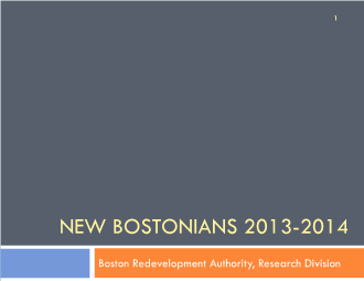 | This Power Point presentation provides demographic and economic data on Boston's foreign-born population, using the 2010 Decennial Census and 2007-2011 American Community Survey data. It includes details on race, countries of origin, languages spoken at home, education attainment, income and more. This report was revised to use the boundaries for the West End and Downtown that went into effect in 2014. See the revised report using the new boundaries