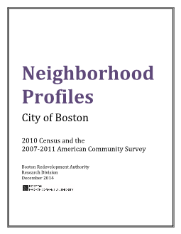| This publication features one-page profiles of each of Boston's neighborhoods, using the 2010 Decennial Census and 2007-2011 American Community Survey data. They include data on total population, race, ethnicity, nativity, income, occupations, poverty and more for each neighborhood. This report was revised to use the boundaries for the West End and Downtown that went into effect in 2014. See the original report using the previous boundaries