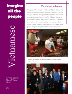 | “imagine all the people” is a series of publications produced by the Boston Redevelopment Authority for the Mayor’s Office of Immigrant Advancement. The series provides a comprehensive profile of Boston’s diverse immigrant communities. This report profiles Bostonians who were born in Vietnam.