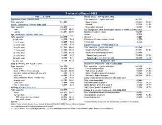 | A two-page reference guide to frequently requested information about Boston's population and development. The primary data source is the 2013-2017 5-year American Community Survey.