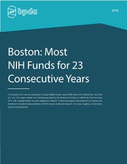 | In 2018, Boston continued its unparalleled 24-year record with more funding from the National Institutes of Health than any other city in the United States. This report delves into funding provided by the National Institutes of Health for FY2018, with a focus on grant recipients in Boston. This report also cites advancements in science and medicine among grant recipients, including research institutes, hospitals, universities, and private companies.