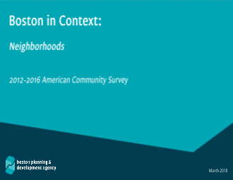 | Boston in Context tabulates various social, demographic, and economic characteristics from the 2014-2018 American Community Survey by Boston Neighborhood. Citywide totals as well as totals for Massachusetts and the United States are provided for comparison.