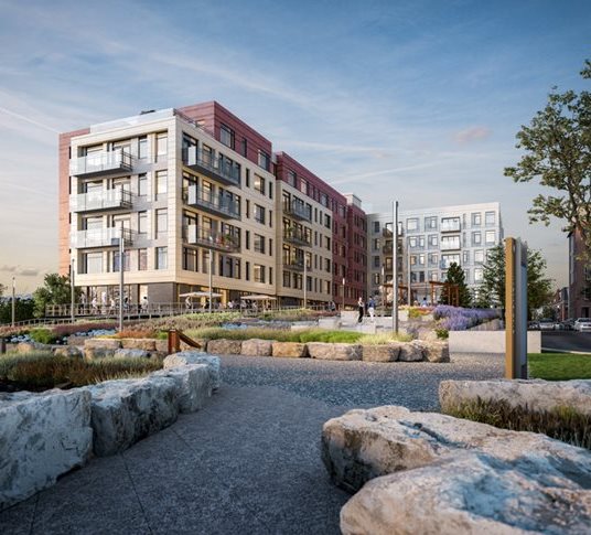 The ground floor of the building will be constructed at elevation 19.5’ (BCB), elevating the building to the future Sea Level Rise Base Flood Elevation. To further resist sea level rise and reduce flood risk, an elevated sheet pile bulkhead shoreline stabilization structure has been designed for the project. The building will achieve LEED v4 for BD+C, New Construction and Major Renovation silver certification with 55 points. Efficient heating and cooling systems, light colored reflective roofing material, water reduction strategies, and electric car charging stations are some of the many integrated sustainable features. The project transforms a vacant urban waterfront site, currently inaccessible to the public, into a mixed-use development with multiple public amenities. A 15’ wide walkway along the waterfront completes the East Boston Harborwalk, connecting the 240’ linear gap remaining between The Eddy and Piers Park.