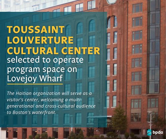 September 20, 2023 BPDA selects Toussaint Louverture Cultural Center to operate tenant space on Lovejoy Wharf