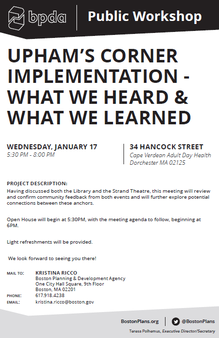 Jan 17, 2018 5:30 PM - 8:00 PM Rss Contact Name:Kristina Ricco Contact Email Address:[email protected] Type:Workshop Location:Cape Verdean Adult Day Health 34 Hancock Street Dorchester, MA 02125 Contact Phone:617.918.4238