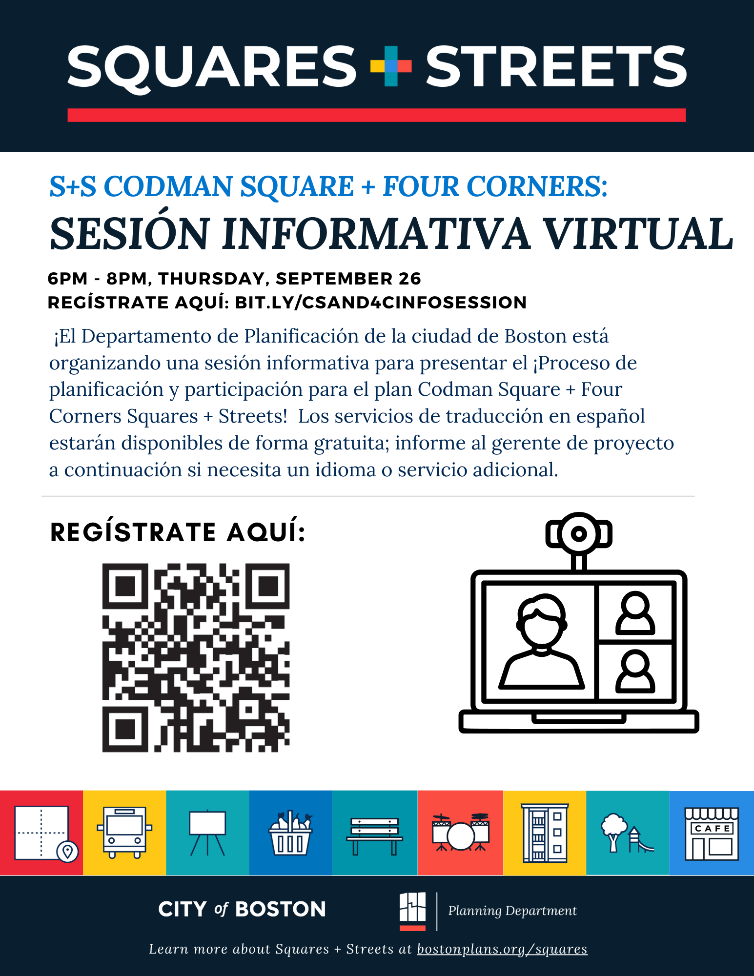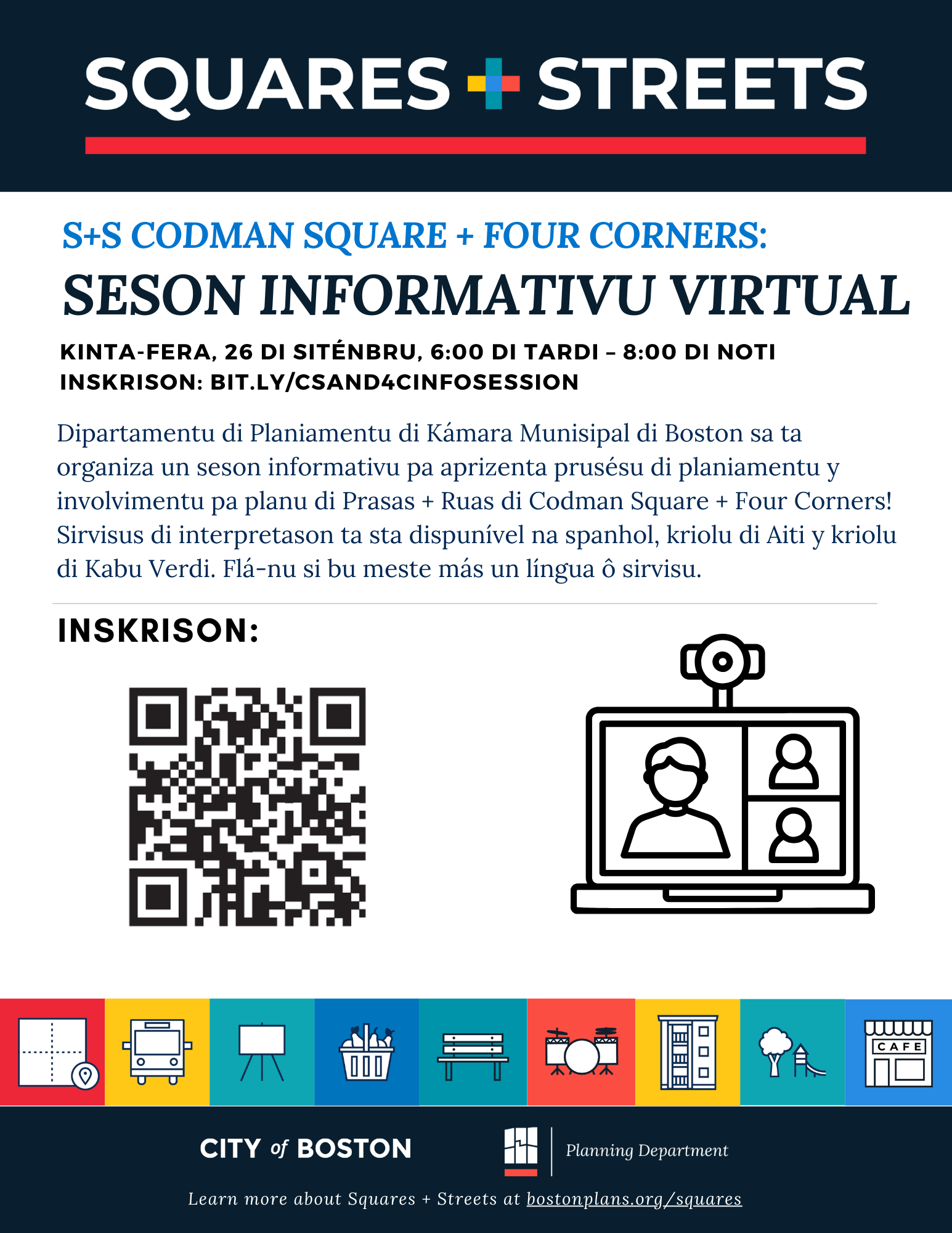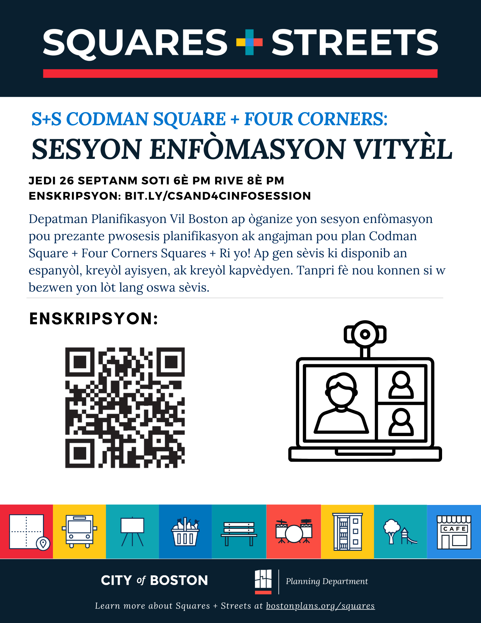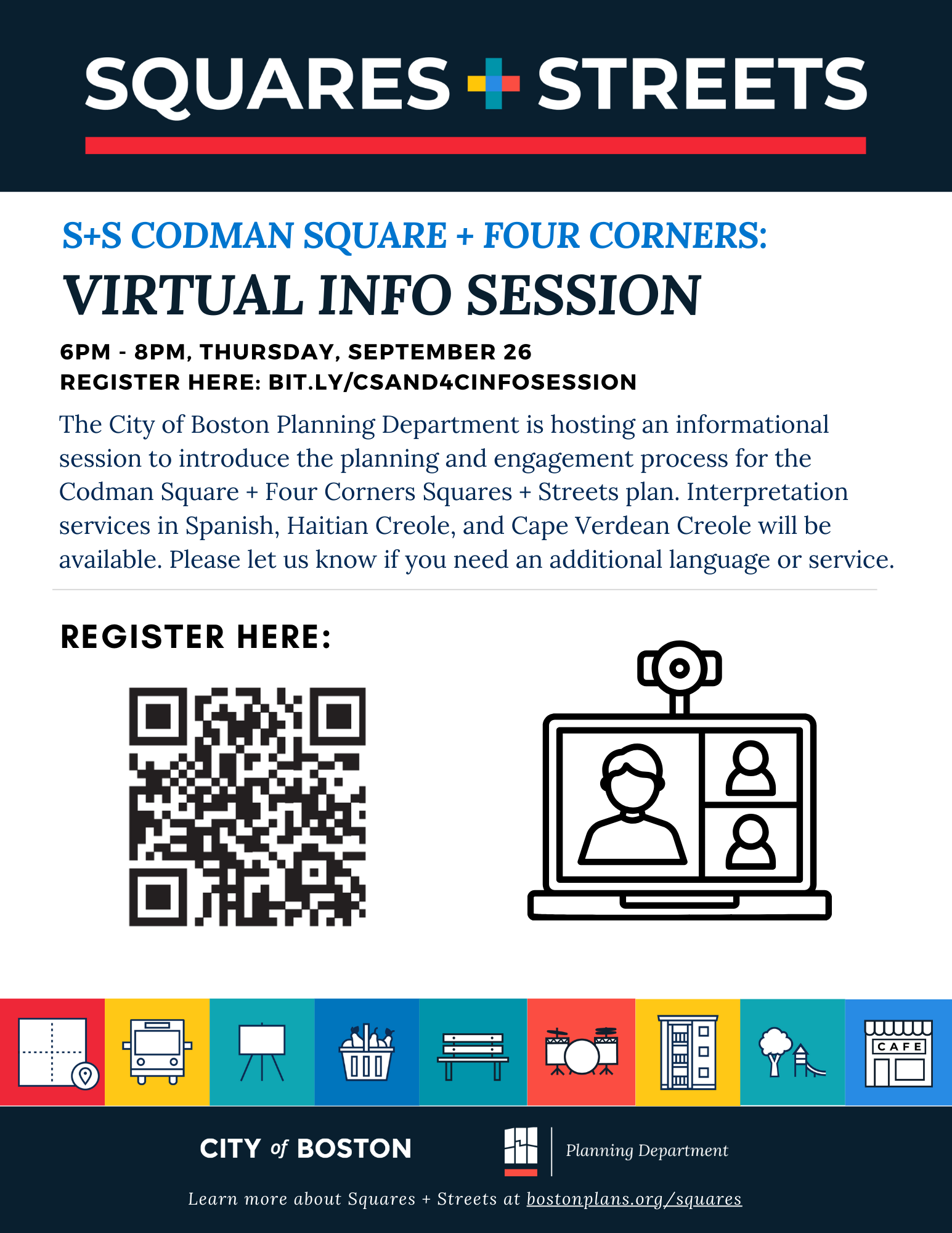 Description: Please note: this meeting has been cancelled and will be rescheduled. The City of Boston Planning Department is hosting an informational session to introduce the planning and engagement process for the Codman Square + Four Corners Squares + Streets plan! At this event, community members can learn more about the Squares + Streets planning & zoning processes while helping us understand their priorities, history, and hopes for Codman Square + Four Corners. Interpretation services in Spanish, Haitian Creole, and Cape Verdean Creole will be available, please let us know if you need an additional language or service.