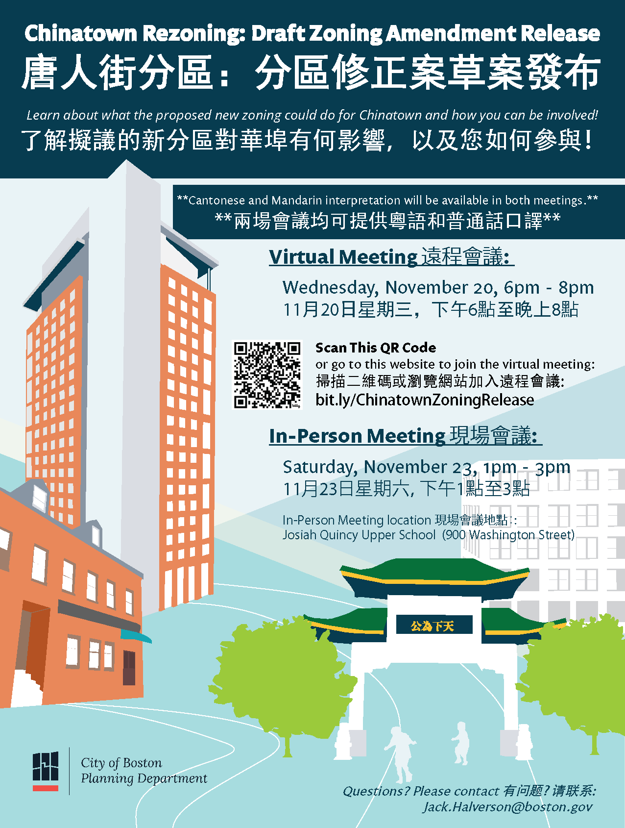 Description: The Planning Department will present the newly proposed Draft Zoning for Chinatown. This Draft Zoning is the result of engagement in Chinatown that started earlier this year. Planning Department Staff will provide an overview of the Chinatown Rezoning Process, explain the Draft Zoning, and be available to answer questions from attendees. Cantonese and Mandarin interpretation will be available.