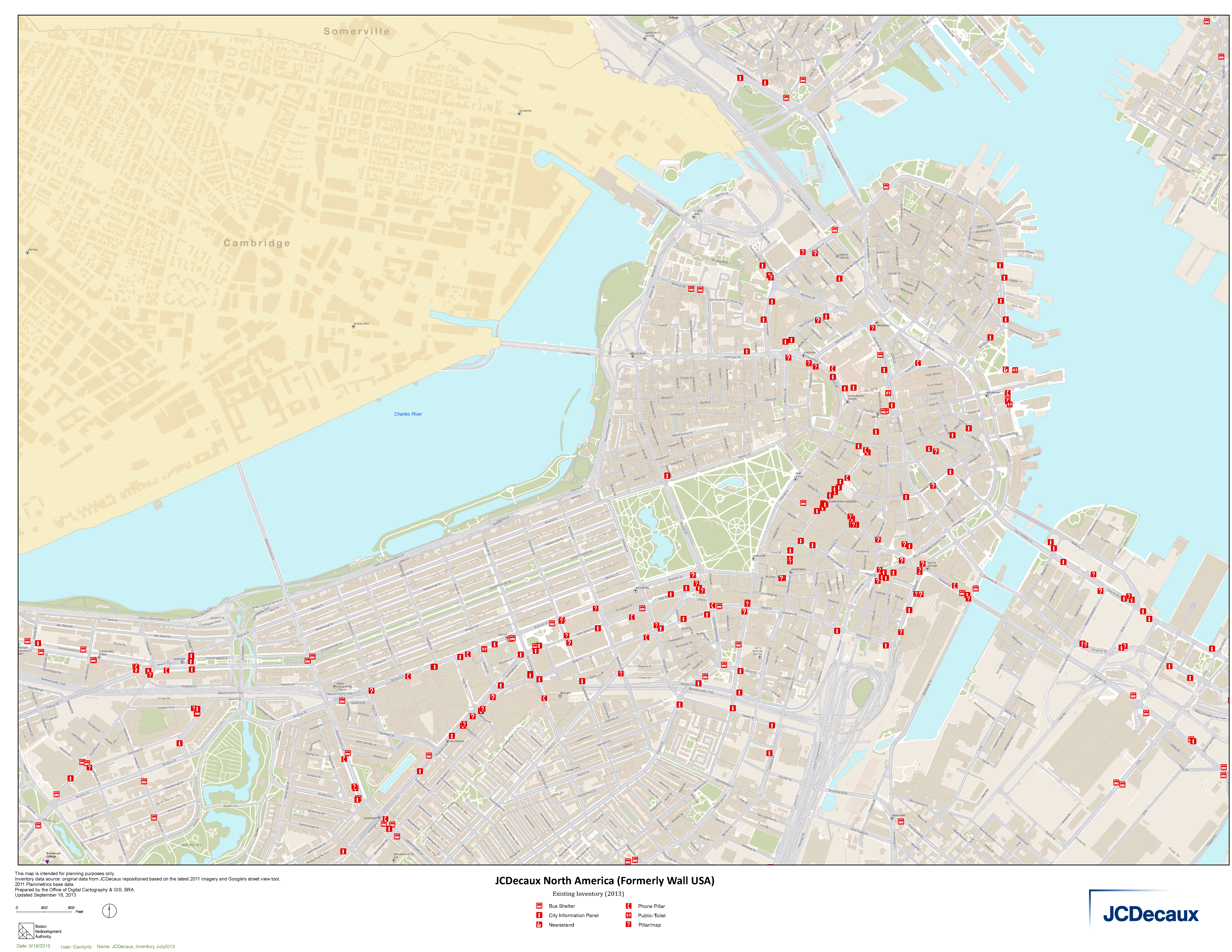 The maps were previously created by JCDecaux (formerly WALL), but in 2011 it became clear that the BRA and City of Boston's GIS departments were better positioned to keep the municipal data regularly updated. The City of Boston and JCDecaux entered into a 25 year contract which ends in 2026. The BRA GIS Division will regularly update the digital maps, including adding new buildings, new roadways, and other significant changes to the City. JCDecaux will print them, add the "You are here" stickers, and post the maps.