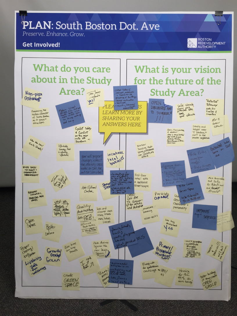 The open house format was new for the BRA, and exciting to be a part of. At both events, local residents, business owners, architects, advocates, and others who might have expected a formal presentation and time for questions instead found their neighbors and the study team checking out a set of big posters and maps on topics like “People,” “Place,” and “Getting Around.” We’d set each room up for interaction and conversation: People used markers, stickers, and Post-Its to share their thoughts about the study area, concerns about its future, and what else they’d like to know. They were able to speak with BRA, City staff, and their neighbors about the places they care about and what they want to see in this new planning process.