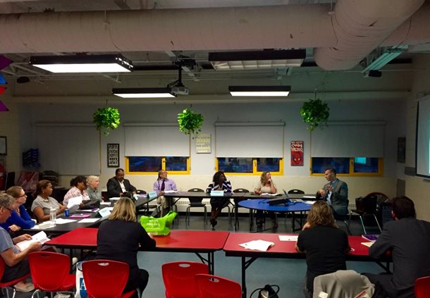 BRA Senior Planner Ted Schwartzberg (pictured far right in the foreground) led the Four Corners/Geneva Avenue Working Advisory Group in their final planning meeting for that section of the MBTA’s Fairmount Indigo Line.