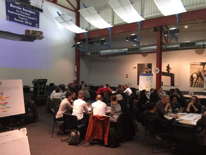 At the Iron Workers Local 7 Hall on Old Colony Avenue, community members split up into breakout groups to discuss their priorities for the Dorchester Avenue corridor between Broadway and Andrew stations along the Red Line.