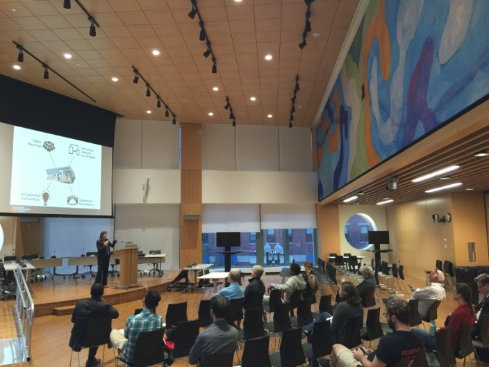 Community members listened as Boston Children’s Hospital’s VP of Real Estate Planning and Development discussed a proposal for a new pedestrian bridge on the hospital’s campus.
