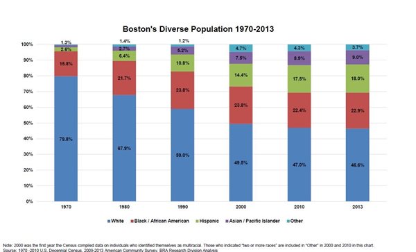 Today, less than half of Boston’s population is white, compared to close to 80% in 1980. Hispanic and Asian immigration has contributed heavily to this trend.