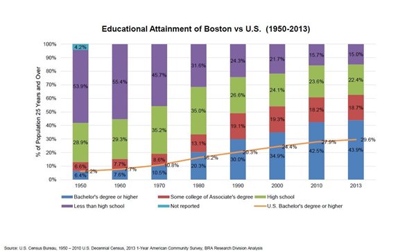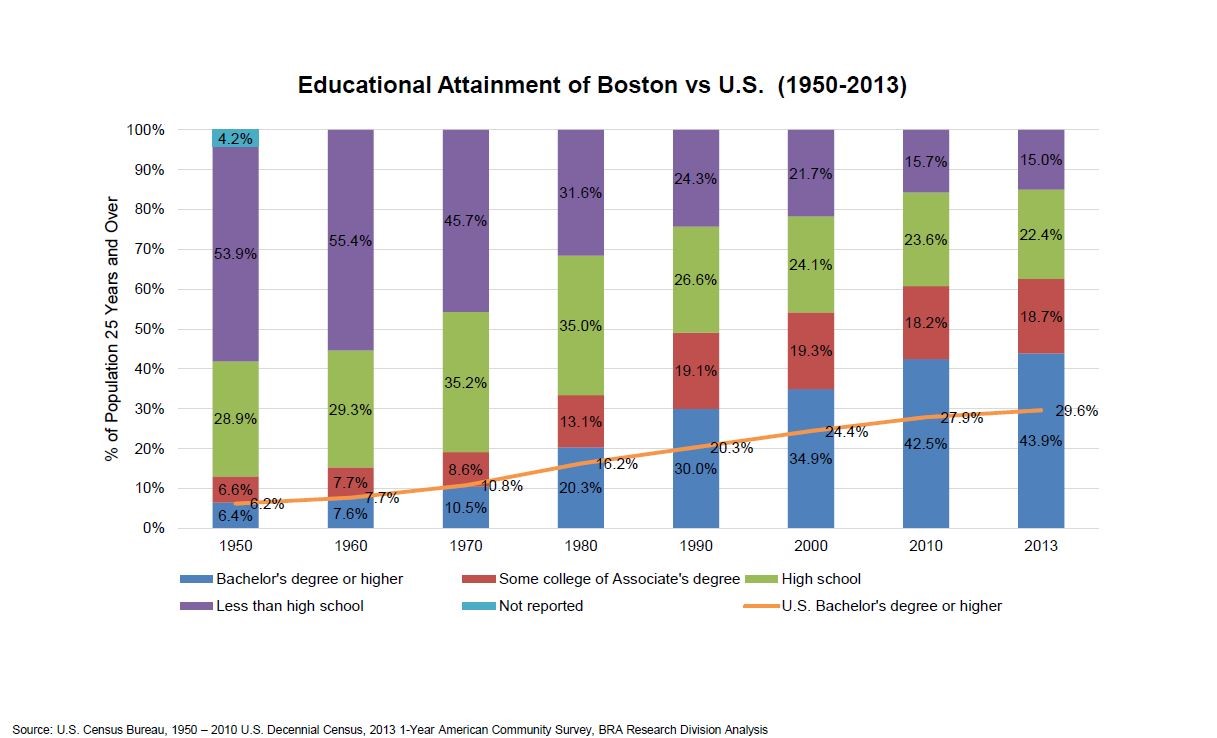 In terms of educational attainment, Boston ranks high among comparable cities, with 44% of our population possessing at least a bachelor’s degree.