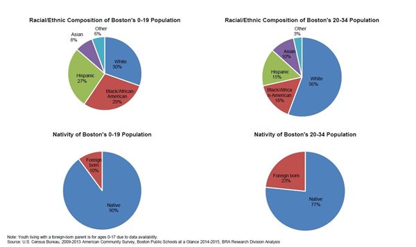 Future generations will likely continue to be more and more diverse thanks Boston’s vibrant immigrant communities. While only 30% of the city’s 0–19 year old population is white, 56% of the 20–34 year old population is white. Similarly, while 10% of the 0–19 population is foreign-born, 23% of the 20–34 year old population is foreign-born.